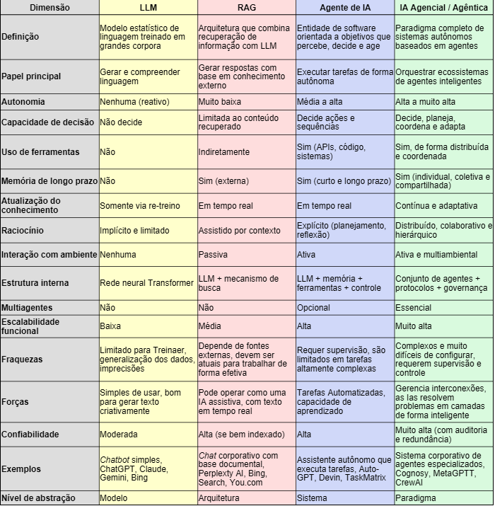 A evolução da IA não substitui os paradigmas anteriores, mas os incorpora e expande, abrindo caminho para aplicações mais robustas, adaptativas e alinhadas a contextos complexos do mundo real. Porém, a maioria das pessoas ainda usa os termos LLM, RAG, Agente de IA e IA Agentica de forma intercambiável, mas eles não são a mesma coisa. Se o pesquisador estiver construindo sistemas de IA generativa (Generative AI – GenAI) deve compreender a diferença entre LLM, RAG, Agente de IA e IA Agentica, suas limitações e aplicações potenciais. A sociedade está migrando de modelos de resposta única para arquiteturas de IA autônomas, baseadas em raciocínio e conscientes de ferramentas. A IA Agentica não é apenas uma IA que responde, mas uma IA que decide, age e coordena.