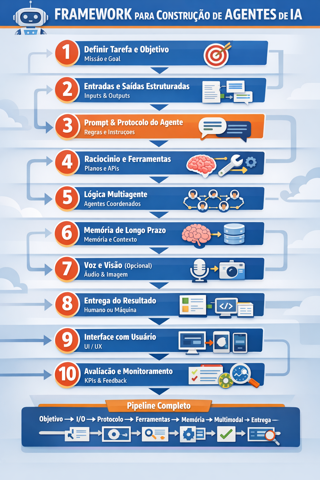 Um framework sistemático e reutilizável para construção de Agentes de IA, alinhado ao estado da arte em IA Agencial, LLMs, RAG, uso de ferramentas, memória de longo prazo e arquiteturas multiagentes e apresentado nesta seção. O framework está estruturado em camadas e fases, de modo a facilitar tanto a implementação prática quanto a avaliação científica e industrial.